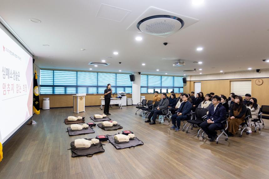 이날 교육은 전문 강사의 지도 아래 ▲응급상황 발생 시 행동 요령 ▲심폐소생술(CPR) 이론 및 실습 ▲자동심장충격기(AED) 사용법 ▲기도 폐쇄 시 응급처치법(하임리히법) 등 실무 위주의 프로그램으로 진행됐다. 특히 참석자들은 교육용 마네킹을 활용해 가슴 압박의 위치와 강도를 직접 체득하는 등 실전과 같은 연습에 임했다.